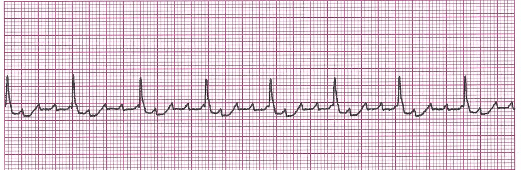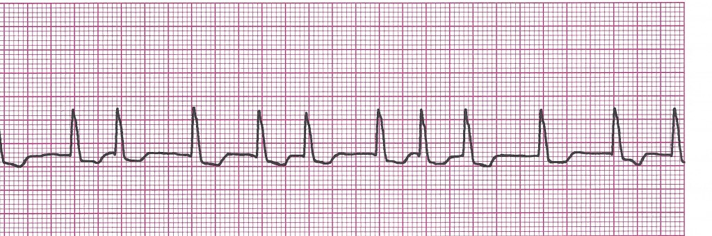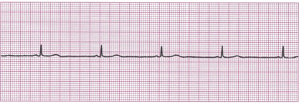 1) Triggered- Fixed rate. Fires according to a predetermined program regardless of patient’s underlying heart rate or rhythm. (i.e. pacer is programmed to send 75 impulses to the ventricles every minute regardless of what the atria are doing as in the strip below).